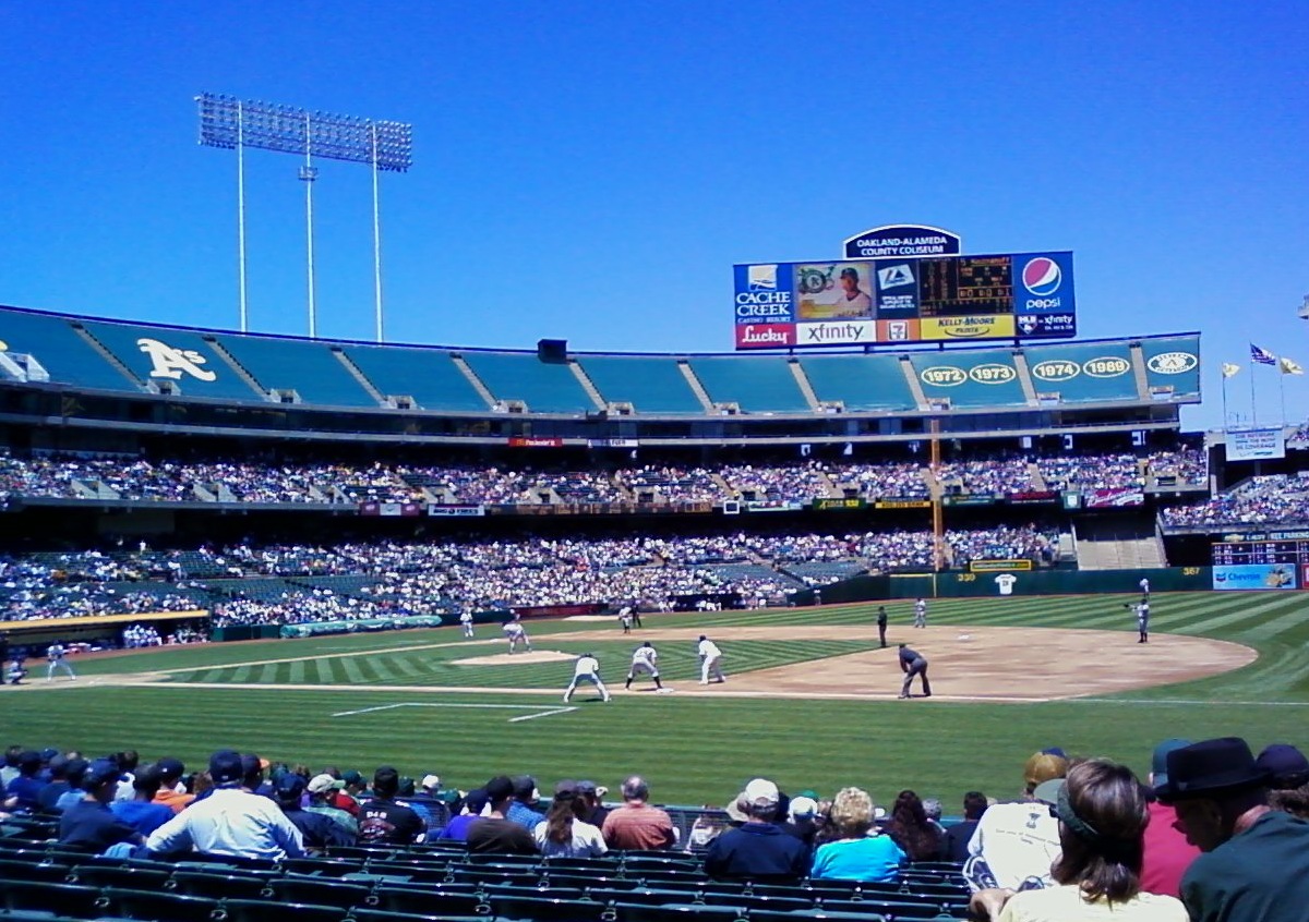 I left work and went to the A's-Detroit game by myself. I sat in a section that was fairly empty, although on three sides I was surrounded by what was reportedly some 20,000 schoolchildren. They were not, shall we say, quiet. In my ears I had the radio commentary of Ray Fosse, Ken Korach, and Vince Cotroneo.